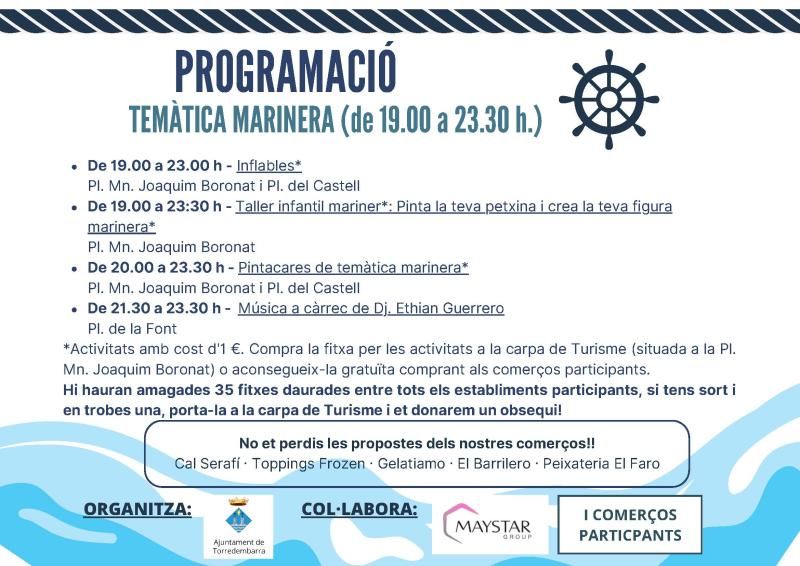 - De 19 a 23.30 h: Taller infantil mariner*: pinta la teva petxina i crea la teva figura marinera, a la plaça de Mn. Joaquim Boronat.