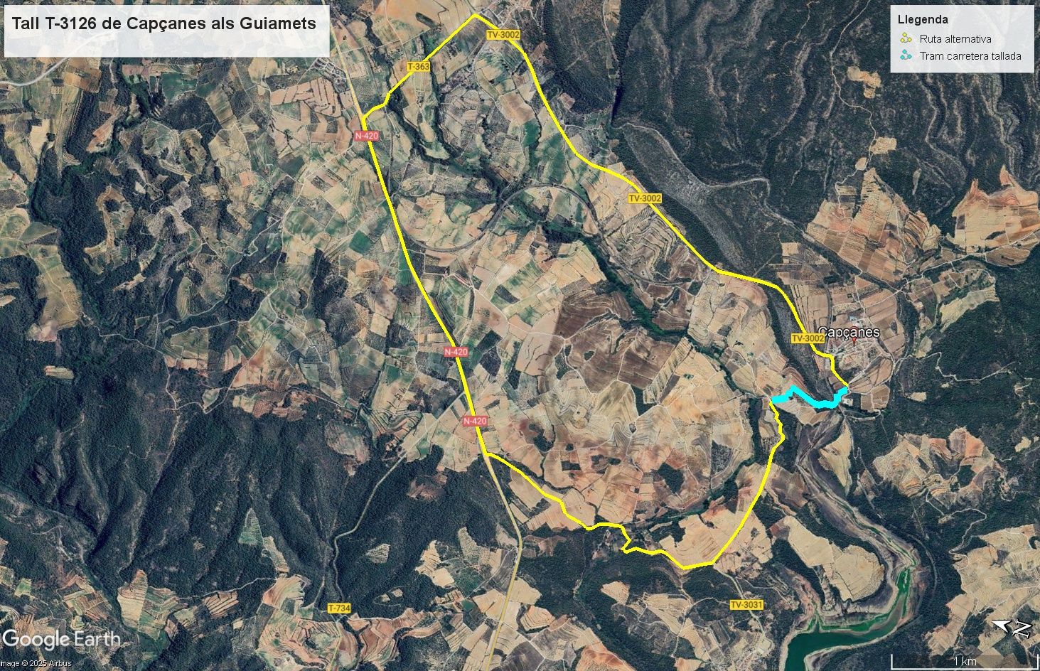 La carretera T-3126, que connecta els municipis de Capçanes i els Guiamets (Priorat), quedarà tallada completament al trànsit entre els dies 6 i 8 d’octubre de 2025. El tall respon a unes obres puntuals de millora de la seguretat viària que inclouen treballs d’estabilització del talús en un tram concret d’aquesta via local.