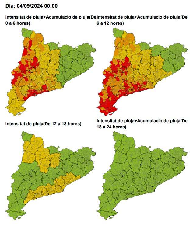 El Meteocat ha activat alertes taronges i també vermelles per perill 4/6 que es produeixin xàfecs intensos, amb acumulacions de fins a 20 l/m² en mitja hora, a tota la façana litoral, especialment entre el Baix Camp i el Tarragonès. A més, hi ha alertes activades per acumulació de fins a 100 litres durant les pròximes 24 hores.
