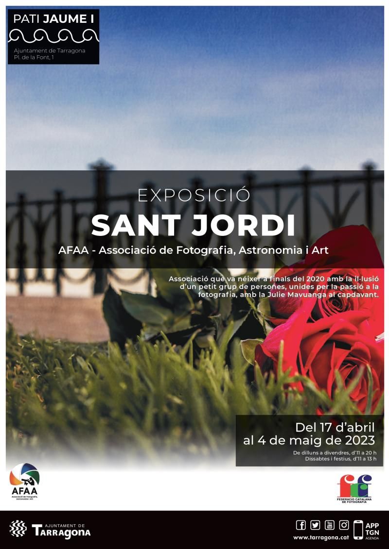Dilluns 17 d’abril a les 19 h al Pati Jaume I s’inaugurarà l’exposició de Sant Jordi de l’Associació de Fotografia, Astronomia i Art, una associació creada el 2020 per un grup de persones unides per la passió a la fotografia i amb Julie Mavuanga al capdavant. En aquesta ocasió, l’exposició és una mostra de fotografies d’alguns dels més de seixanta socis de l’entitat.