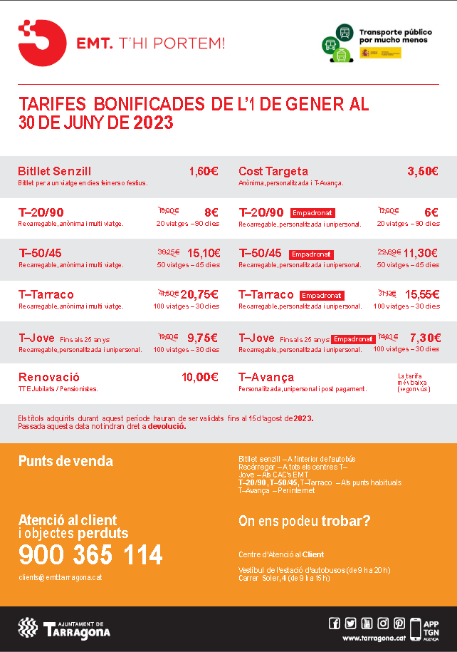 El passat 28 de desembre, el Govern de l’Estat va publicar al BOE el Reial Decret Llei 20/2022, de 27 de desembre, on preveu el finançament de la rebaixa del 30% dels abonaments i títols multiviatge de transport públic urbà, sempre que els respectius Ajuntaments elevin el descompte fins al 50%. Això implica que per tal de poder oferir als ciutadans la reducció de fins al 50% del preu dels abonaments multiviatge, l’EMT ha d’assumir amb càrrec del seu propi pressupost el descompte del 20% en el preu dels abonaments i títols multiviatge.