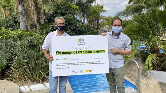 “Posa’t la Gorra!” als clients que s’allotjaven a les seves instal·lacions. Aquest dimecres al matí, Joan Antón, president de l’Associació de Càmpings i en representació de tots els establiments participants, ha fet entrega dels 4.350 euros recaptats amb l’acció a Miguel Javaloy, delegat de l’AFANOC Tarragona.