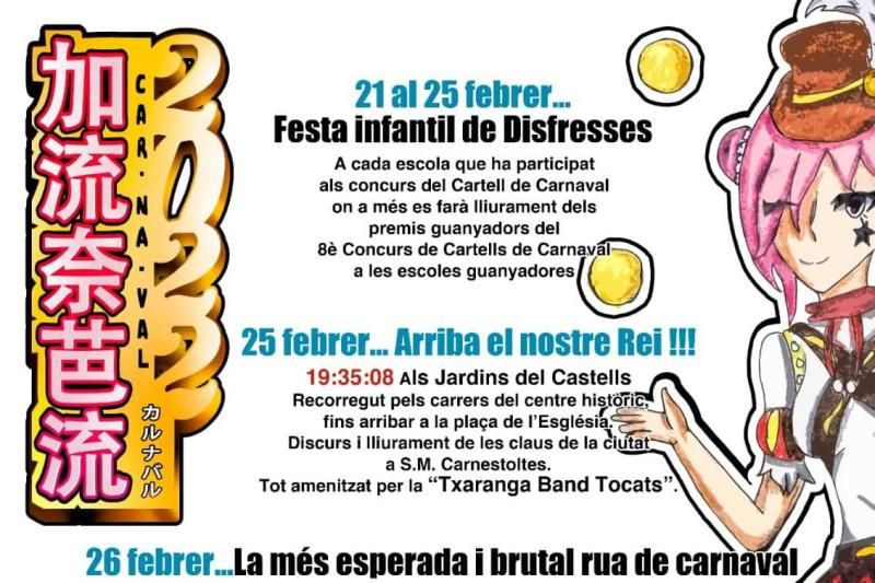 Cal destacar que entre el 21 i el 25 de febrer tindrà lloc la festa infantil de disfresses a cadascuna de les escoles del municipi, on també s’hi lliuraran els premis als guanyadors del 8è Concurs de Cartells de Carnaval. Donada l’actual situació de pandèmia, tots els actes programats estan subjectes a possibles canvis.