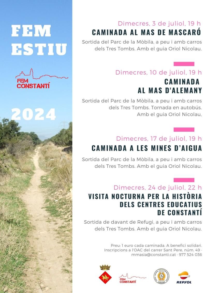 El dimecres 10 de juliol la caminada anirà fins al Mas de l'Alemany (la tornada es farà en autobús) i el dimecres 17 de juliol es farà una caminada per descobrir les mines d'aigua que hi ha al terme municipal. L’última caminada, prevista pel dimecres 24 de juliol, consistirà en una visita nocturna per la història dels centres educatius de Constantí.