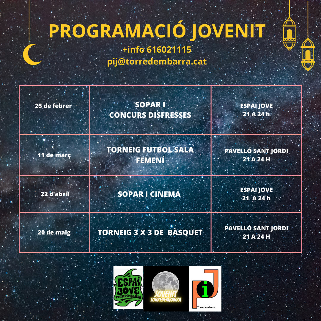- 25 de febrer, a l’Espai Jove, de 21 a 24 h: Sopar i Concurs de Disfresses.