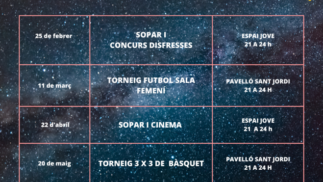 - 11 de març, al Pavelló Municipal Sant Jordi, de 21 a 24 h: Torneig de Futbol sala femení.