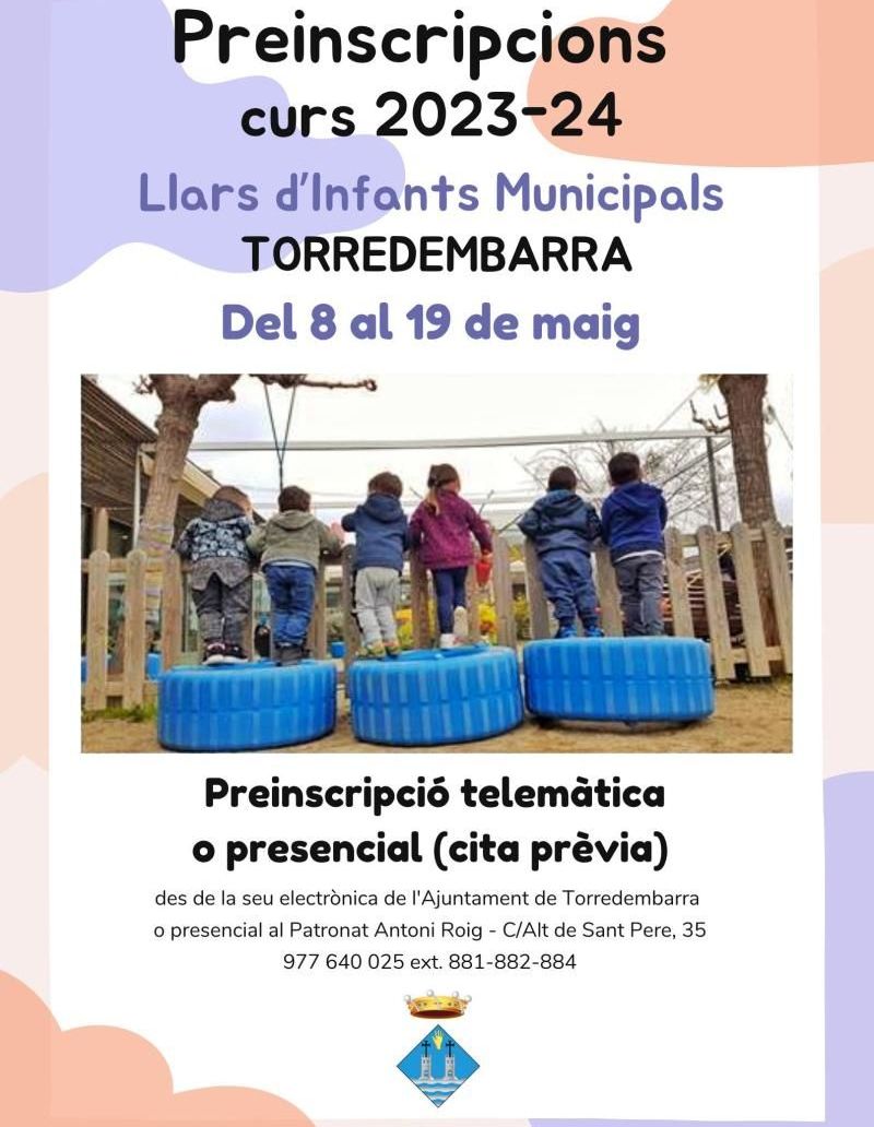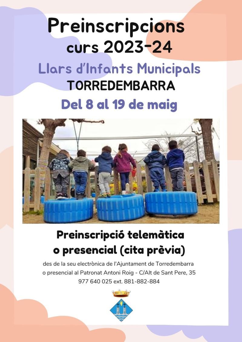 La Regidoria d’Educació de l’Ajuntament de Torredembarra informa que del 8 al 19 de maig s’obrirà el termini de preinscripcions a les llars d’infants municipals el Cirerer i els Gegants de la Torre per al proper curs.