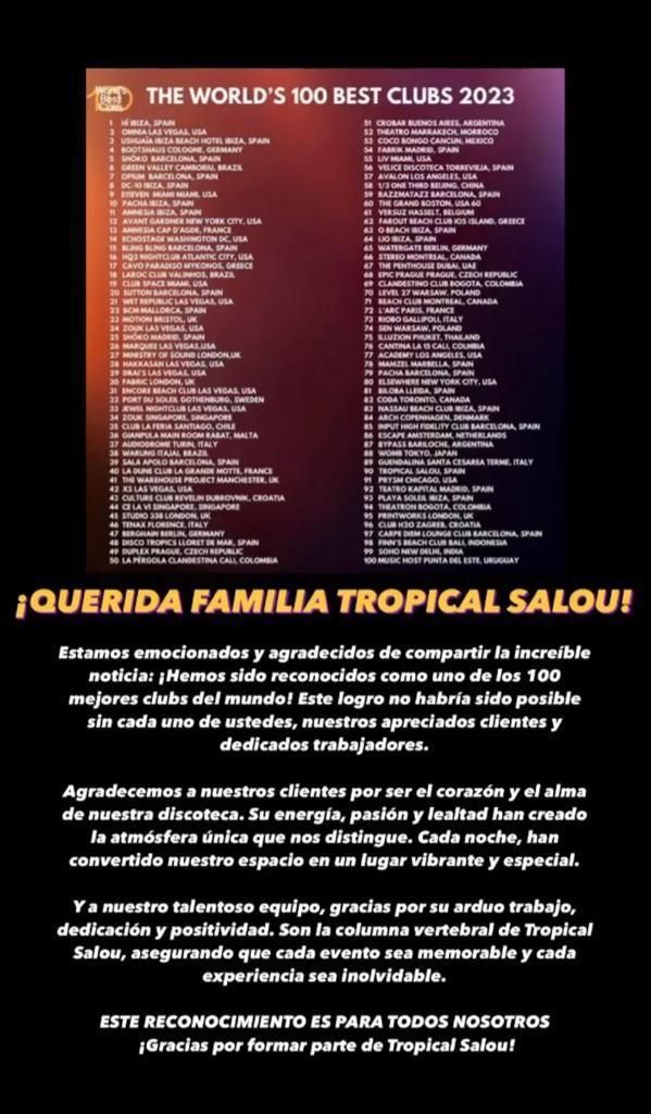 Una discoteca de Salou ha sortit a la prestigiosa llista internacional "The World's 100 Best Clubs". En primera posició es troba la discoteca Hï Ibiza i es corona per quart any consecutiu com el millor club nocturn del món. "The World's 100 Best Clubs" 2023 s'ha seleccionat entre un total de 373 locals nominats, de 65 països diferents. Apareixen locals de fins a 30 països, entre ells, Espanya el que té més clubs amb 27 dels 100, seguida dels Estats Units amb 20 i el Regne Unit amb 6.