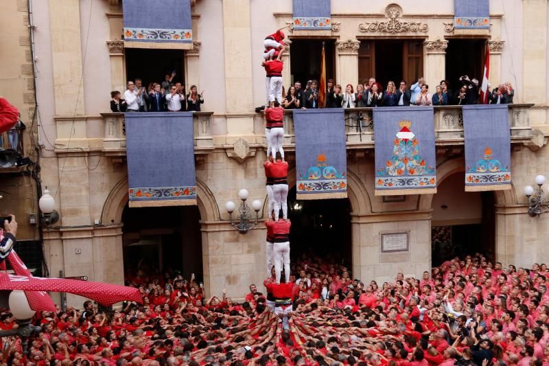 La Colla Joves Xiquets de Valls ha obert la diada amb el 4 de 9 sense folre, conscients que el darrer els va quedar en intent a Terrassa. S'ha fet un silenci sepulcral i el castell ha pujat ferm, només ha patit una petita revinclada quan han col·locat sisens. Amb l'aleta i la sortida de la canalla, l'estructura s'ha anat tancant, però els diables vermells han aconseguit completar-lo fent desfermar tota la plaça. Sense pensar-s'ho, com un autèntic duel vallenc, la Colla Vella dels Xiquets de Valls també ha començat amb el 4 de 9 sense folre. Una construcció feta gairebé a la perfecció, demostrant la confiança que li tenen a aquest castell dificilíssim que ja havien descarregat el Primer Diumenge de Festes a Tarragona.