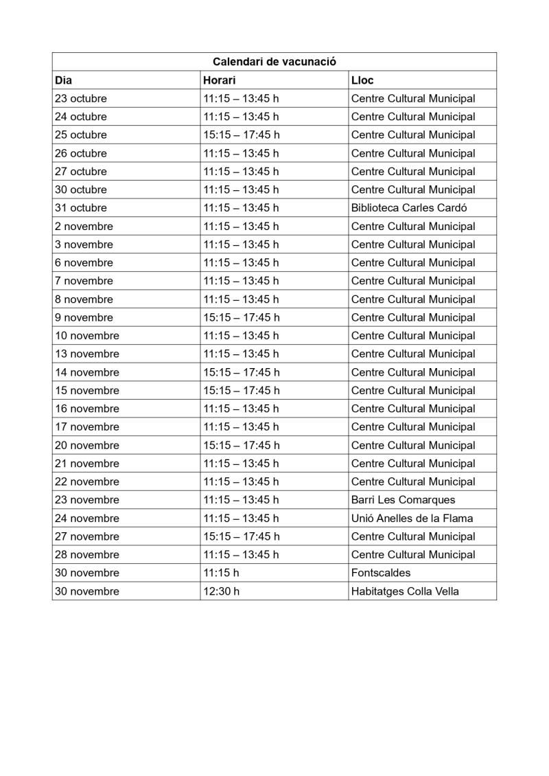 A més del Centre Cultural, la campanya de vacunació es descentralitza com en anys anteriors a diferents zones i barris: Biblioteca Carles Cardó (31 d’octubre), Barri de les Comarques (23 de novembre), Unió Anelles de la Flama (24 de novembre), i Habitatges de la Colla Vella i Fontscaldes (30 de novembre).