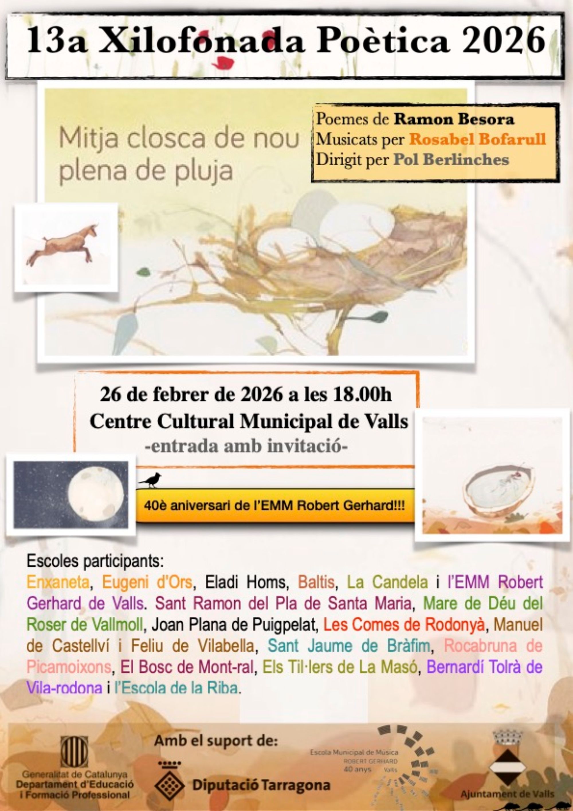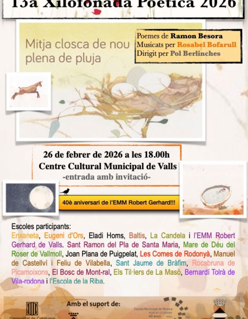 L’Escola Municipal de Música Robert Gerhard de Valls presenta la 13a edició de la «Xilofonada Poètica», un projecte singular que combina poesia i música a través del cant i dels instruments d’Orf. El concert comunitari previst per al dimecres 11 de febrer, canvia de data per motius d’agenda i se celebrarà finalment el dijous 26 de febrer, a les 18 h, al Centre Cultural Municipal.