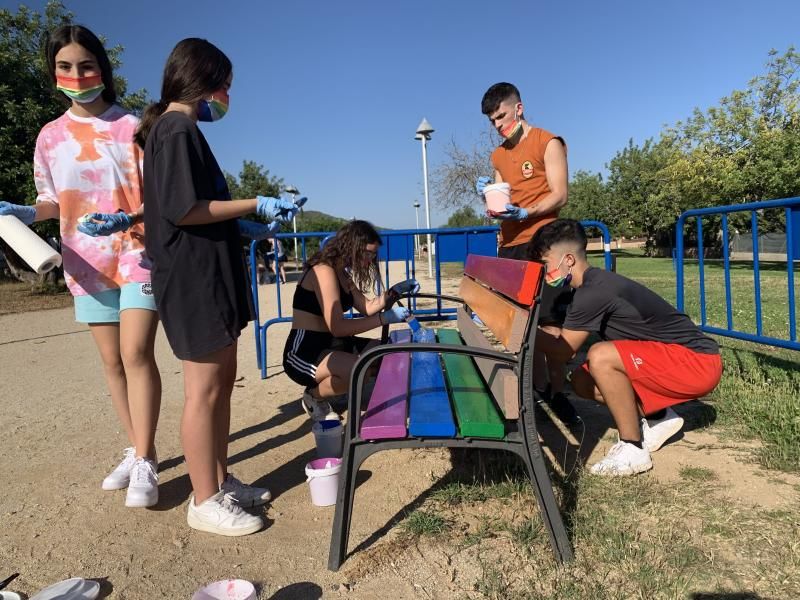 A les 6 de la tarda, un grup de persones –sobretot joves- es van concentrar a la plaça del Mercat per pintar 2 bancs del passeig Rafael Ciuró dels colors de l’arc de Sant Martí.
